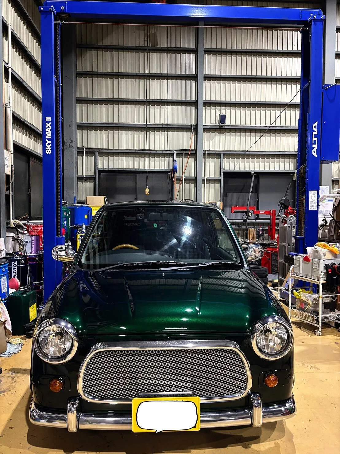 今回ご入庫いただいたお車は、先日、全面塗装をさせて頂いたお客様です。クラシカルなデザインが魅力の一台です。工場内で丁寧に作業を進める中、深みのあるグリーンのボディが照明で美しく映え、お客様も仕上がりを楽しみにされていました。全面塗装で綺麗になったボディーを維持したいとのご要望にお応えでき喜んで頂き良かったです。