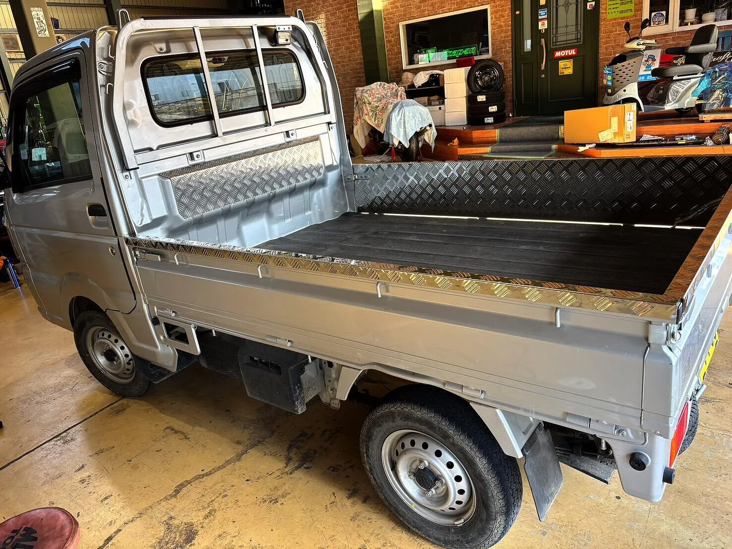 まずは安全対策として、前後録画対応の高性能ドラレコを設置。これにより万が一の事故やトラブル時も安心です。また、画像にもあるように荷台には新しいアオリカバーを装着し、耐久性と見た目の美しさが格段にアップしました。アルミ製チェック柄プレート仕様なので傷や汚れにも強く、お客様からも「これなら長持ちしそう」と喜びのお声をいただきました。
